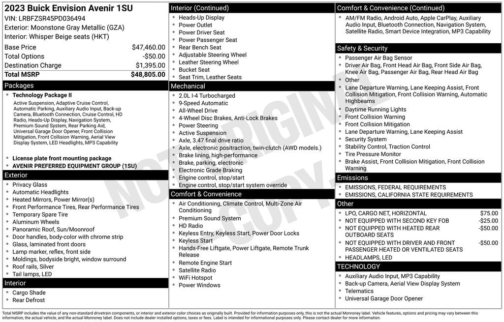 **One Owner**Accident Free**2023**Buick**Envision**Avenir**AWD**Navigation**Panoramic Sunroof*Heated Steering Wheel**Master every mile with our One Owner, Accident Free 2023 Buick Envision Avenir AWD that brings you bold benefits for better adventures in Moonstone Gray Metallic! Motivated by a TurboCharged 2.0 Liter EcoTec 4 Cylinder that serves up 228hp matched to a 9 Speed Automatic transmission for quick and quiet acceleration. Continuous damping control helps you move with tremendous confidence, and our All Wheel Drive SUV also scores nearly 29mpg on the highway. Our Envision's detailed design cues draw attention with enhanced LED lighting, 20-inch alloy wheels, a panoramic sunroof, heated power-folding mirrors, silver roof rails, and a hands-free liftgate.Up to any task, our Avenir cabin is refined and ready for your next drive with first-class amenities like heated/ventilated leather front and heated rear seats, a heated leather steering wheel, dual-zone automatic climate control, pushbutton ignition, keyless access, and a high-tech mobile command center. Highlights include a 10.2-inch touchscreen, wireless Android Auto®/Apple CarPlay®, full-color navigation, WiFi compatibility, voice control, Bluetooth®, wireless charging, and a Bose sound system.Buick takes an intelligent approach to your safety with a head-up display, HD Surround Vision, a digital rearview mirror, enhanced automatic braking, lane-keeping assistance, blind-spot monitoring, and more. All that and stylish strength come together in our Envision Avenir! Save this Page and Call for Availability. We Know You Will Enjoy Your Test Drive Towards Ownership!