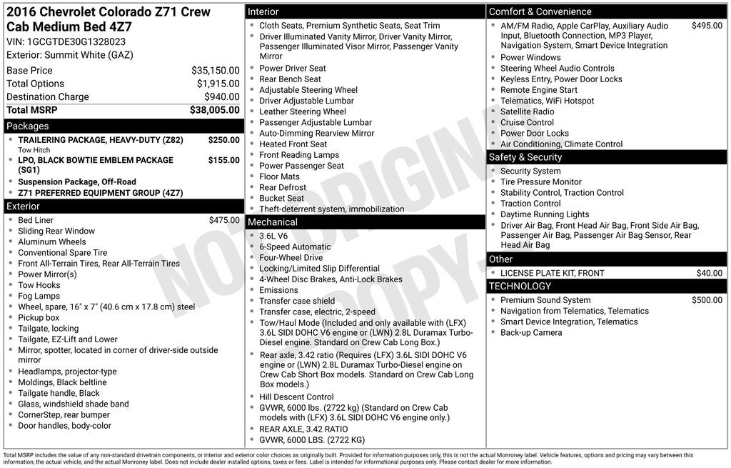 Our hard working **2016**Chevrolet**Colorado**Z71**Crew Cab**4X4**Bluetooth**Heated Seats** dares to turn heads in Summit White! Powered by a 3.6 Liter V6 that generates 305hp connected to a 6 Speed Automatic transmission and Z71 Off-Road suspension, you will love the look. This Four Wheel Drive scores nearly 26mpg on the highway and allows you to enjoy all the utility and capability you desire! The chiseled physique of our Colorado turns heads whether you are tackling a brutal trail or pulling up to the valet.