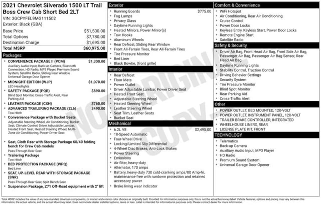 A tough truck, our 2021 Chevrolet Silverado 1500 LT Trail Boss Crew Cab 4X4 can take charge on the road or off in Black! Motivated by a 6.2 Liter EcoTec3 V8 generating 420hp connected to a 10 Speed Automatic transmission for towing, hauling, and having fun. This Four Wheel Drive truck lives up to its trail-friendly billing with a 2-speed transfer case, a locking rear differential, and a Z71 off-road suspension, and it scores nearly 19mpg on the highway. Designed to show off, our Silverado's design boasts LED lighting, black alloy wheels, red recovery hooks, an EZ Lift power lock/release tailgate, robust skid plates, a bed cap, running boards, a spray-on bedliner, and a CornerStep rear bumper.