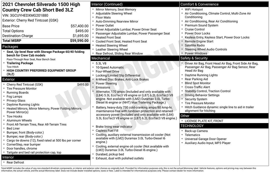 Welcome to our Accident Free 2021 Chevrolet Silverado 1500 High Country Crew Cab 4X4 that shows off strength, style, and a bold Cherry Red Tintcoat design! Motivated by a 5.3 Liter EcoTec3 V8 that offers 355hp paired with a 10 Speed Automatic transmission for optimum capability and plenty of muscle. This Four Wheel Drive truck takes you to the top of the mountain without breaking a sweat, and it also scores nearly 22mpg on the highway. A rugged look revs up our Silverado exterior that boasts LED lighting, high-intensity headlamps, alloy wheels, dual exhaust outlets, a spray-on bed liner, running boards, a tonneau cover, a power tailgate, and chrome recovery hooks and assist steps.