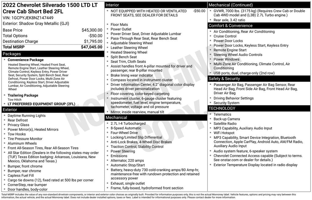 Our work ready One Owner, Accident Free 2022 Chevrolet Silverado 1500 LTD LT Crew Cab 4X4 in Shadow Gray Metallic is here to pick up where other trucks leave off! Motivated by a 2.7L Turbo delivering 310hp paired to an 8 Speed Automatic transmission to help you get down to business. This Four Wheel Drive truck also adds to its capability with an automatic locking rear differential, and it sees nearly 20mpg on the highway. Bold and brawny, our Silverado makes a big impression with its chrome accents, LED lighting, heated power mirrors, an EZ Lift power lock/release tailgate, alloy wheels, and a trailer hitch with guidance.