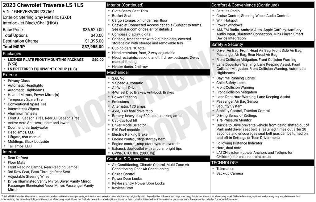 Why BUY from Gregg Young Chevy Norwalk? When you choose this Sterling Gray Metallic 2023 Chevrolet Traverse LS with 36,303 miles, you are not just buying a used vehicle - you are investing in quality, reliability and peace of mind. Our clientele depend on us for Transparent Pricing, Convenience and, most importantly, Customer FIRST Service! All purchases include 5 year Complimentary Maintenance Package, valued at over $1,000! What this vehicle includes: Preferred Equipment Group 1LSAll-Wheel Drive System Safety and Security Forward collision mitigation - Forward thinking. You look away for just a second and suddenly the vehicle in front of you has stopped. That's when the forward collision mitigation system comes to life. When it senses an impending impact, it will activate a combination of features to help prevent or reduce the severity of an accident. Forward collision mitigation is always looking ahead. Pedestrian impact prevention - An extra step toward safety. Pedestrians don't always stop, look, and listen, but with Pedestrian Impact Prevention, your vehicle is equipped to better see them and avoid them. This system constantly monitors the road ahead to identify and track pedestrians. It projects that image to an interior display screen, AND should an impact become likely, Pedestrian impact prevention takes steps to avoid a collision.Technology and Telematics Smart device mirroring - Smartphone, meet smart car. You can control your device through your vehicle's infotainment system. Smart device mirroring brings together safety and convenience by making it easier to find what you're looking for while keeping your eyes on the road. Apple CarPlay/Android Auto smart device wireless mirroring Mobile hotspot - WiFi on the fly. Connect your devices to the Internet through your vehicles private mobile hotspot and take the internet wherever your journey takes you, without eating up your data allowance. Find the hotspot with mobile hotspot. EMISSIONS, FEDERAL REQUIREMENTS, ENGINE, 3.6L V6, SIDI, VVT, TRANSMISSION, 9-SPEED AUTOMATIC, WHEELS, 18" (45.7 CM) BRIGHT SILVER PAINTED ALUMINUM, TIRES, P255/65R18 ALL-SEASON BLACKWALL, STERLING GRAY METALLIC, SEATS, FRONT BUCKET, JET BLACK/CHAI, PREMIUM CLOTH SEAT TRIM, AUDIO SYSTEM, CHEVROLET INFOTAINMENT 3 SYSTEM, LICENSE PLATE FRONT MOUNTING PACKAGE When you choose a Certified Pre-Owned vehicle from Gregg Young, youre not just buying a used car youre getting extra protection, added peace of mind, and built-in value you wont find with an ordinary pre-owned vehicle. Every Certified Pre-Owned vehicle must pass an extensive 172-point inspection performed by trained technicians. From engine and transmission performance to interior quality, safety features, and road-test standards, we verify the vehicle meets strict certification requirements before it ever reaches our lot. Ask if this vehicle qualifies for our Certified Pre-Owned Program 12-Month / 12,000-Mile Premier Coverage Drive confidently from day one. Our Premier Warranty* protects you against unexpected repairs for your first 12 months or 12,000 miles. Whats covered? Practically all major vehicle components (excluding maintenance items and wear-and-tear parts) Electrical, mechanical, interior, exterior, and more giving you true peace of mind with your purchase. 36-Month / 100,000-Mile Powertrain Protection Our Certified Powertrain Warranty** keeps you covered long after you leave the dealership, protecting many of your vehicles most important and expensive components for up to 36 months or 100,000 miles. What's covered? Engine Parts Transmission/Transaxle Parts Drive Axle Parts Hybrid Components Transfer Case Components Come on in to Gregg Young Chevy Norwalk today at 2501 Sunset Drive Norwalk IA 50211 or call (877) 566-9371 to schedule a test drive! What sets Gregg Young Chevrolet of Norwalk apart? Family-run leadership Gregg Young and his children actively manage the dealership, blending experience with a personal touch. Community co