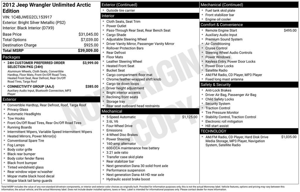Once inside our Sahara trim, you will appreciate heated power mirrors, power locks and windows, keyless entry, heated front seats, GPS Navigation, and a leather-wrapped steering wheel. If you want to take an open-air cruise, remove the top, put on some shades, crank up the Infinity sound system with available satellite radio, and hit the road!