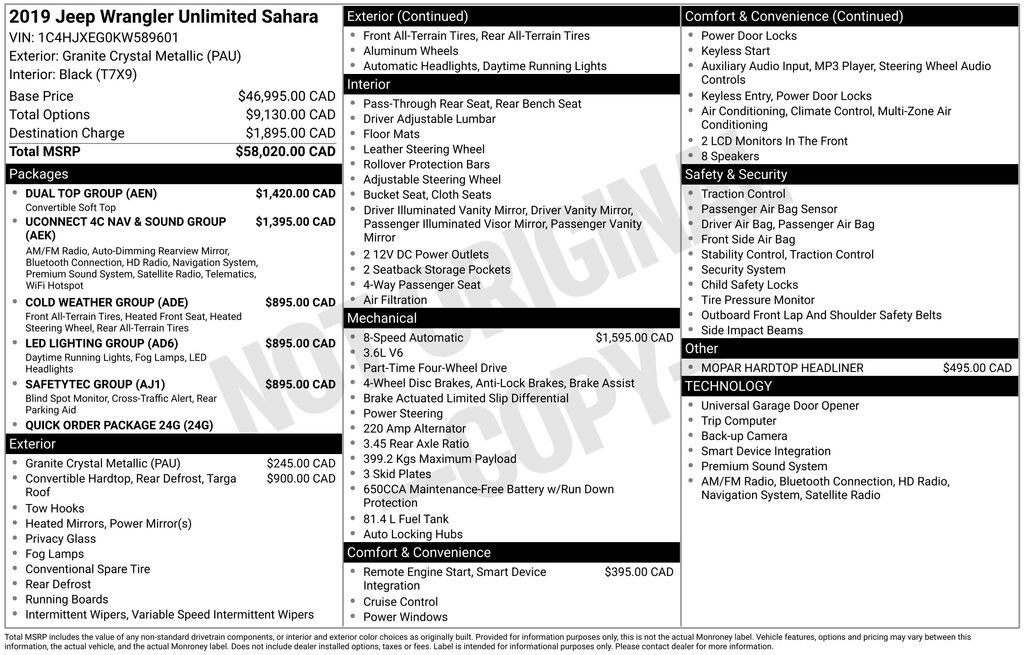 Improve your outlook on life in our **Accident Free**2019**Jeep**Wrangler Unlimited**Sahara**4 Door**4X4**Heated Seats**Navigation** that's proudly displayed in Granite Crystal Metallic! Powered by a 3.6 Liter Pentastar V6 offering 285hp paired with an innovative 8 Speed Automatic transmission that's robust enough for off-road action. This award-winning Four Wheel Drive SUV will impress you as it attains nearly 23mpg on the highway and delivers legendary traction, ground clearance, and maneuverability that make your most adventurous dreams come true! Our Sahara elevates your style and boasts rugged good looks with automatic halogen headlights, fog lamps, and bold two-piece fender flares over alloy wheels.