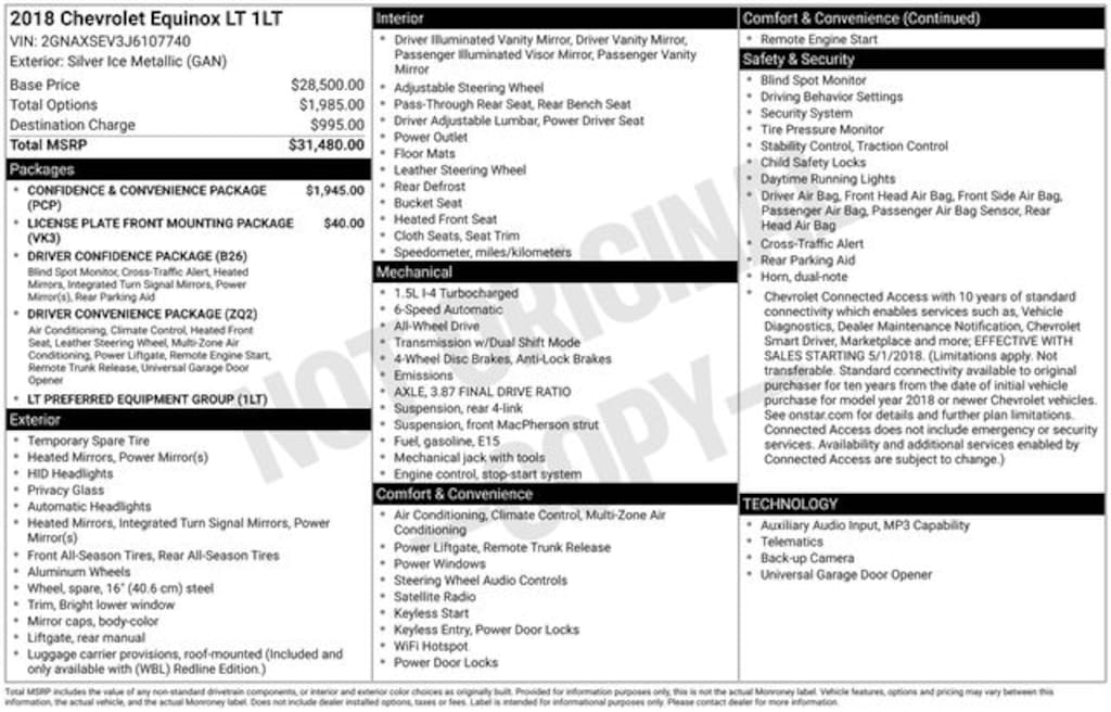 An optimal blend of power, efficiency, and style, our **Accident Free**2018**Chevrolet**Equinox**LT**AWD**Apple CarPlay/Android Auto**Heated Seats** is proudly presented in Silver Ice Metallic! Powered by a TurboCharged 1.5 Liter 4 Cylinder that offers 170hp connected to a responsive 6 Speed Automatic transmission. This capable All Wheel Drive SUV will please you with its confident demeanor as it handles beautifully while rewarding your wallet with nearly 32mpg on the highway. Our Equinox LT strikes a perfect balance of sporty sophistication with its sweeping silhouette. High-intensity discharge headlamps, deep-tinted rear glass, and great-looking wheels emphasize smart styling.