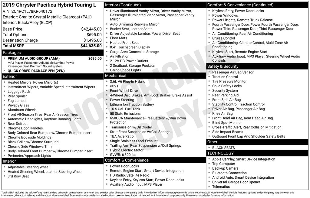 Climb inside our Certified 2019 Chrysler Pacifica Hybrid Touring L presented in Granite Crystal Metallic ushering in a fresh era of minivans! Powered by a 3.6 Liter gas V6 and Dual Electric Motors to produce a total of 260hp while connected to an innovative eFlite Si-EVT transmission. This Front Wheel Drive offers a total driving range of 566 miles, 84MPGe, and a total electric driving range of nearly 28 miles. You'll appreciate that our lithium-ion battery can be charged in as little as 2 hours with an available 240-volt level III charger. Whether you're just cruising around the block or heading out on a long road trip, our Minivan will serve you well!