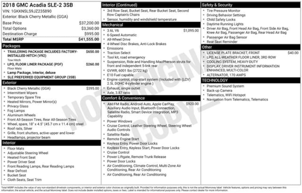 Our great looking Accident Free 2018 GMC Acadia SLE-2 AWD comes to life in a beautiful Black Cherry Metallic. Powered by a 3.6 Liter V6 offering 310hp paired with a 6 Speed Automatic transmission with advanced stop/start technology. With this, All Wheel Drive SUV scores nearly 26mpg on the road and enjoys responsive handling with functionality that will help you take on your day with ease. Sleek and stylish, the contemporary crossover design of our SLE-2 exudes elegance with LED running lights, fog lights, roof rails, and beautiful wheels.