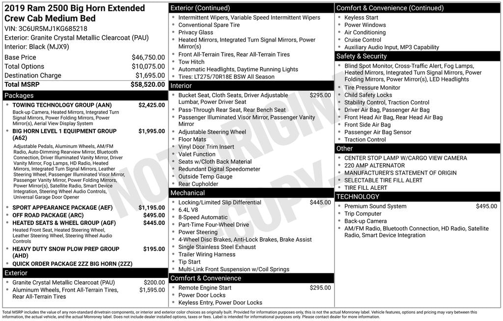 Our powerful **2019**RAM 2500**Big Horn**Mega Cab**4X4**Heated Seats**Heated Steering Wheel** is bold, comfortable, and capable in Granite Crystal Metallic! Motivated by a 6.4 Liter HEMI V8 that offers 410hp connected to an 8 Speed Automatic transmission for fantastic passing and pulling authority. This Four Wheel Drive truck also handles hard work with heavy-duty shocks, and its design is both strong and stylish. Exterior highlights include an exclusive grille, quad halogen headlamps, chrome accents, heated power trailer mirrors, and a Class V hitch receiver.