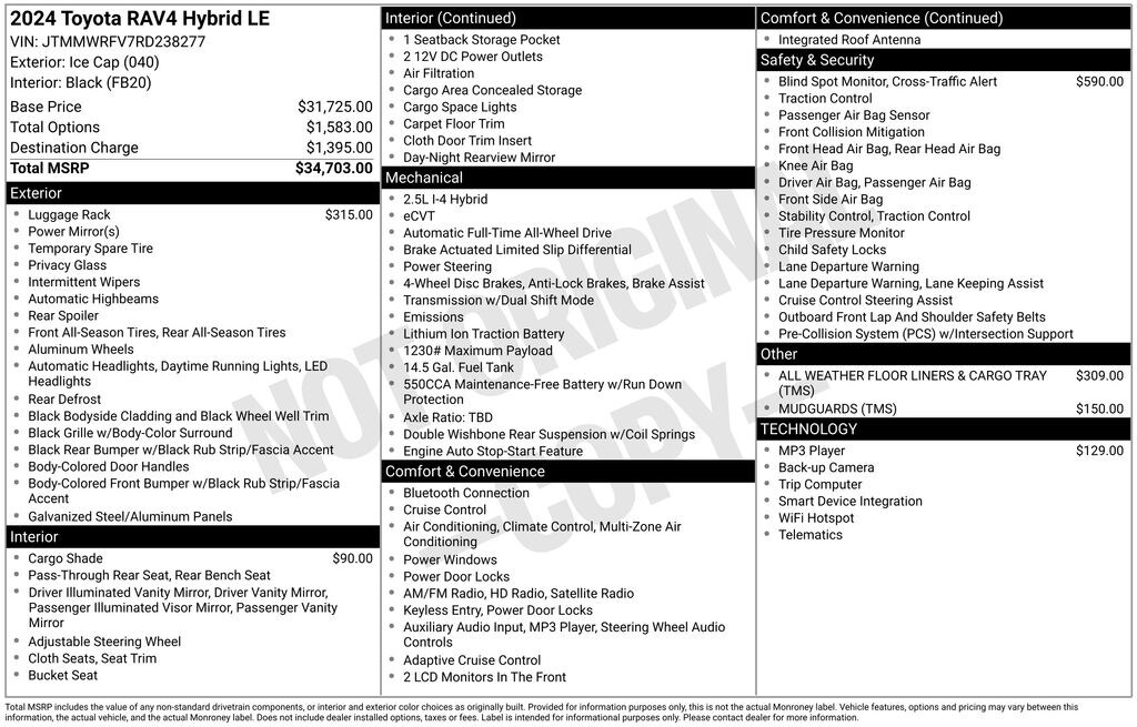 Command attention with our Accident Free, One Owner 2024 Toyota RAV4 Hybrid LE AWD, and you can move out without missing a beat in Ice Cap! Motivated by a 2.5 Liter 4 Cylinder and 2 Electric Motors offering a combined 219hp to an eCVT. Active Cornering Assist and Trail Mode are standard for comfortable capability, and this All Wheel Drive SUV scores nearly 41mpg in the city. Setting a high bar for style, our RAV4 rides with LED lighting, dual chrome-tipped exhaust, black bumper accents/fender moldings, low-profile roof rails, and alloy wheels. It's proof good looks can go a long way!